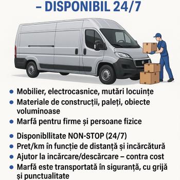 Disponibilitate NON-STOP (24/7) • Preț/km în funcție de distanță și încărcătură • Ajutor la încărcare/descărcare – contra cost • Marfa este transportată în siguranță, cu grijă și punctualitate • Autoutilitară curată, întreținută, spațioasă