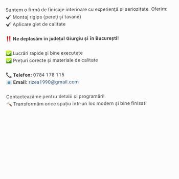 Te-ai săturat de așa ziși meseriași !? Apelează la noii cu mare încredere . Calitatea și seriozitatea își spune cuvântul,contactează ne și vei avea o lucrare cum ți-ai dorit,fără bătăi de cap Montăm rigips,glet ,lavabilă,parchet ,tapet Etc Suntem disponibili la nevoile dumneavoastră!