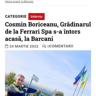 La doar 21 de ani a plecat din satul natal Sărămaș, comuna Barcani, pe meleaguri străine pentru a-și câștiga existența de zi cu zi, la fel cum au făcut mulți alți tineri din județ și din toată țara. A muncit cu seriozitate, în Italia, timp de 17 ani, iar anul trecut tânărul Cosmin Boriceanu, care la începutul lunii aprilie va împlini 38 de ani, a decis că este momentul să revină acasă, în satul pe care l-a purtat mereu în suflet și căruia i-a dus dorul. În bagajul lui a pus și Scrisoarea de referință, întocmită de Vincenzo Greico, șeful de întreținere și servicii generale Ferrari Spa cu sediul în Maranello, în care acesta a scris, printre altele că: „Dl. Boriceanu Cosmin Constantin, născut în Întorsura Buzăului, (…) a lucrat la FERRARI SPA ca manager de activități la întreținere spații verzi. (…) Cosmin a dat dovadă de dăruire absolută și profesionalism, (…) s-a remarcat prin amabilitatea și educația care s-a reflectat și asupra personalului gestionat.(…) De-a lungul timpului a câștigat încrederea întregii companii, devenind un element de neînlocuit, un punct de referință pentru activități pertinente, și un exemplu de dăruire față de muncă. (…) La acestea adaug mulțumirile mele personale pentru Cosmin, pentru colaborarea prețioasă din acești ani, respectându-i alegerea vieții de a se întoarce acasă.” Iar ACASĂ, Cosmin Boriceanu a luat rapid decizia de a deschide o firmă în domeniul grădinăritului pe care l-a practicat cu atâta dăruire și responsabilitate. Deși au trecut doar 6 luni de când s-a întors, acesta este bucuros de faptul că are de lucru iar oamenii apelează la serviciile sale. Doamne ajuta
