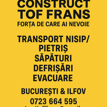 Construct Tof Frans Suntem o companie de construcții și transport din București–Ilfov, pregătită pentru lucrări de orice dimensiune. Flota noastră include două basculante 8x4 pentru volume mari, două bascule de 3,5 tone pentru acces îngust în oraș, un excavator, un buldoexcavator și un picon pentru spargeri și lucrări grele. Facem săpături, demolări, transport, nivelări și lucrări complete coordonate cap-coadă. Livrăm rapid, lucrăm corect și suntem prezenți exact când spunem. Fără complicații, fără surprize. Servicii: – Săpături fundații, șanțuri, utilități – Demolări și spargeri cu picon – Transport agregate, pământ, moloz (8x4 și 3,5 t) – Nivelări și pregătire teren – Lucrări complete cu coordonare pe tot fluxul